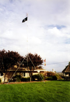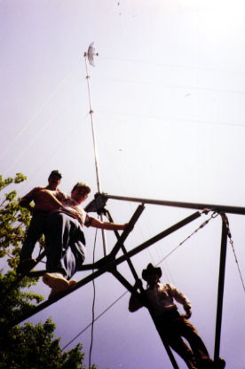 CIRCA 1998 - These two pictures show deployment of the "Tower of Ian" at Charlie Urbanowicz's home. The boys on the tower in the left photo are (L to R) Ian Turnbull, John Kennedy and Skip Frisbee. The guy adjusting the antenna push-up collar in the right photo is Ian Turnbull. We connected Charlie to the campus LAN via a Cylink 512K wireless Ethernet bridge. The tower was fully set-up in three hours and the LAN connection was complete and operational in five hours (total time). The tower gave us 55 feet of height for the semi-parabolic antenna so we could shoot over the trees in the area. The test lasted for four months and was very sucessful, we even ran a five location Mbone session for two weeks over the link (I am afraid Charlie cussed us out pretty good when it came time to remove it!).